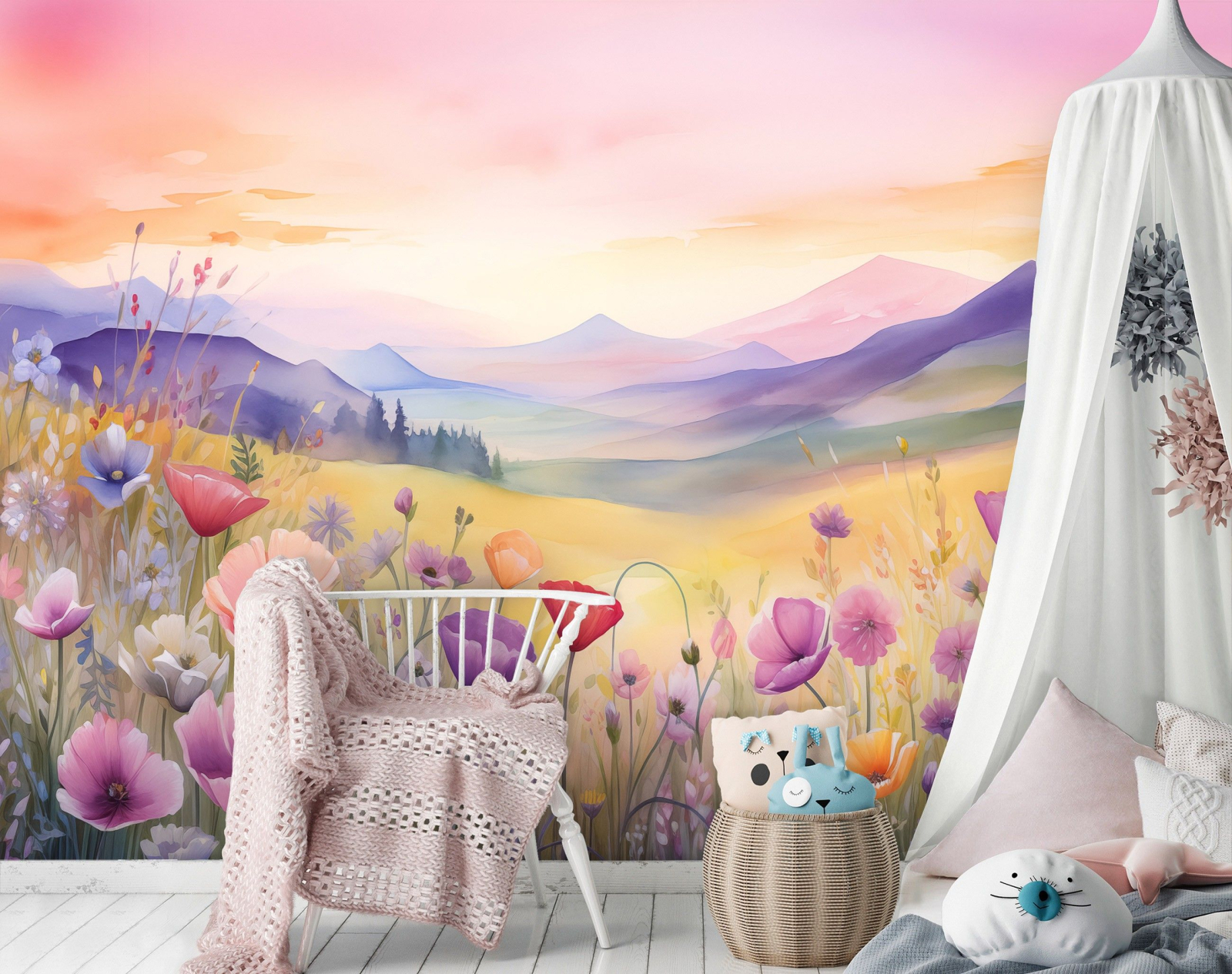 Слънцето бавно се спуска зад далечните планини, обагряйки небето в нежни нюанси на розово, оранжево и златисто. Топлите цветове се сливат в хармонична прегръдка, напомняйки за мекия преход между деня и нощта. В далечината синкави и лилави хълмове се губят в леки преливки, създавайки усещане за безкрайност и спокойствие. Пред този величествен пейзаж се разстила пъстра поляна, изпъстрена с безброй цветя в различни форми и нюанси. Розови, лилави, червени и оранжеви макове разцъфват сред тревисто-зелените стъбла, а нежни сини и бели цветчета се издигат сред тях, сякаш нашепват своите истории на вятъра. Листата и стръковете се поклащат леко, като че ли прегръщат слънчевата светлина и разпръскват топлина и нежност. Сред тази приказна гледка се усеща нещо магично – сякаш самата природа разказва история, в която цветовете танцуват, формите оживяват, а хоризонтът приканва към мечти и приключения. Всяко цвете, всяка сянка и лъч светлина носят усещане за красота, спокойствие и хармония, които могат да обгърнат детското въображение и да го поведат към свят, изпълнен с доброта и вдъхновение. |