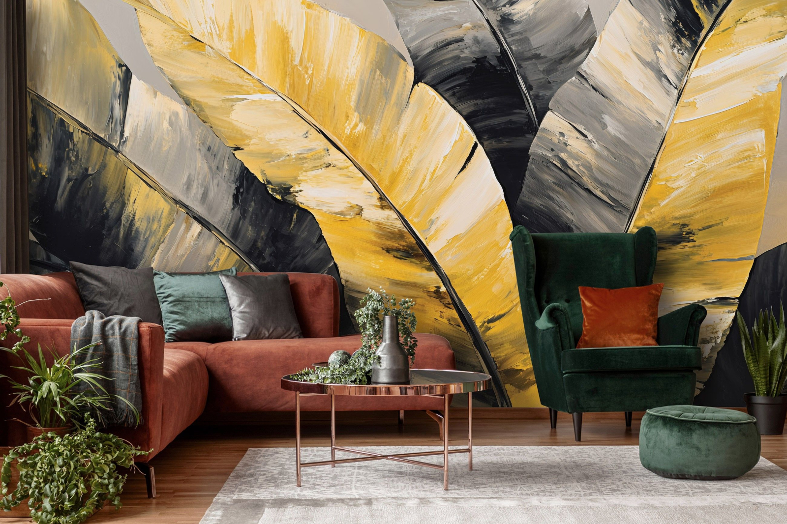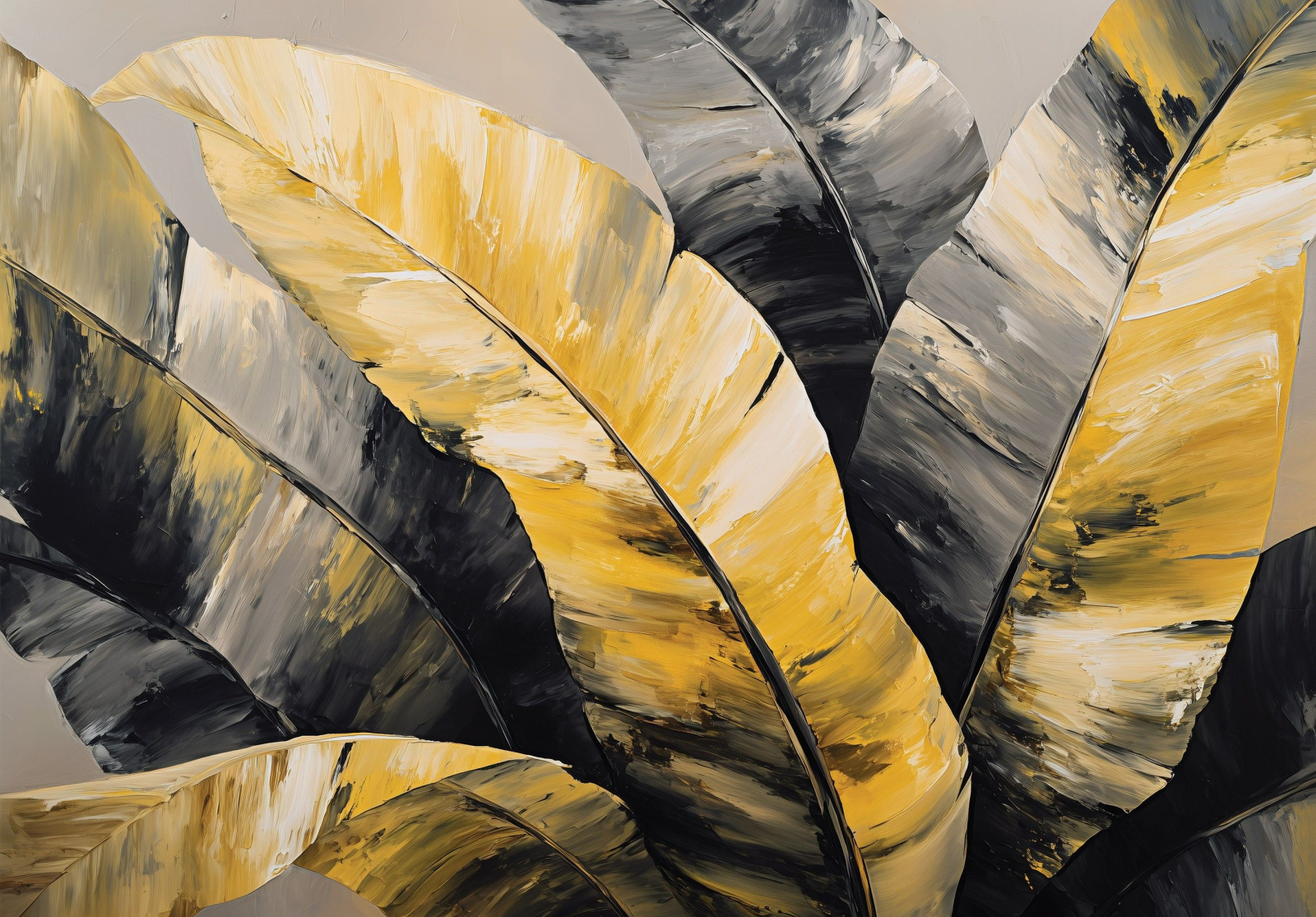 Флис Фототапет LEAVES художествено пано графит и жълто